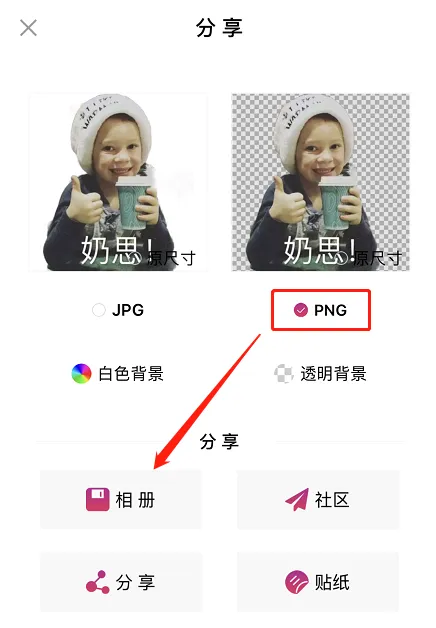 调整完后,点击右上角的“下一步”,这里可以根据自己情况更改背景颜色,也可以直接保存透明的PNG格式,最后在保存至相册即可。
