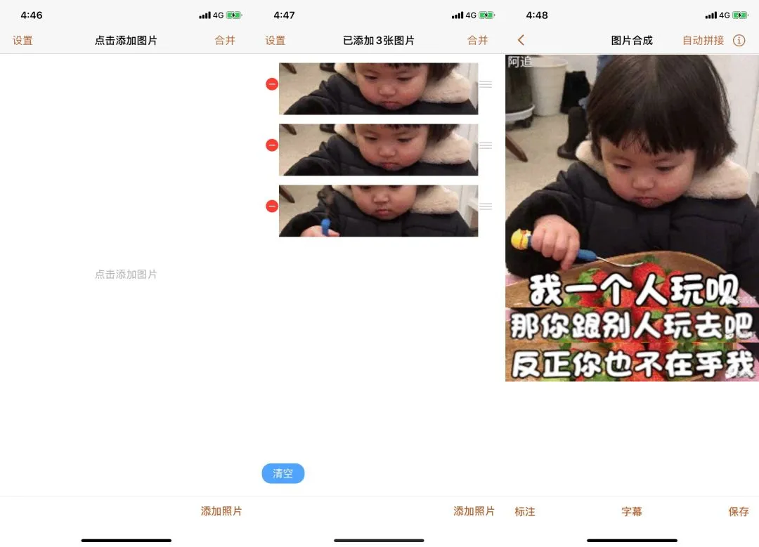 操作也很简单,先同时按住两张图,长按上方的图,然后再向上拖拽下方的图片即可完成拼接。