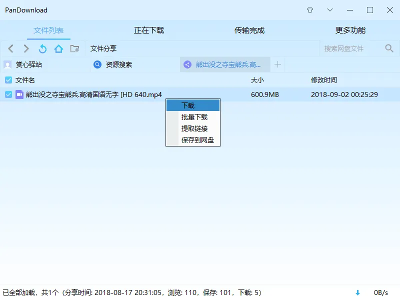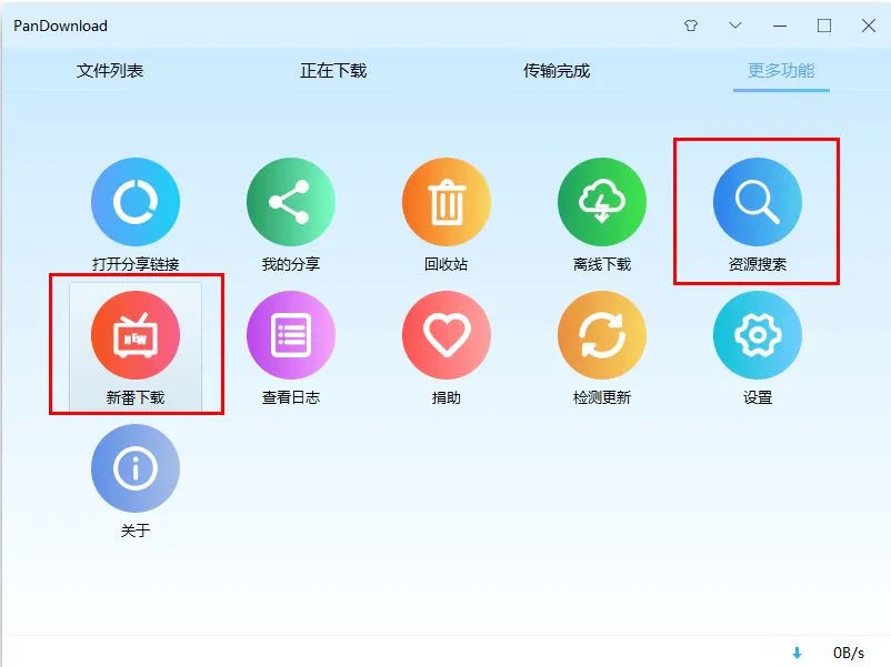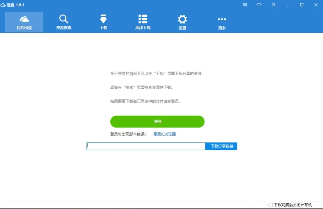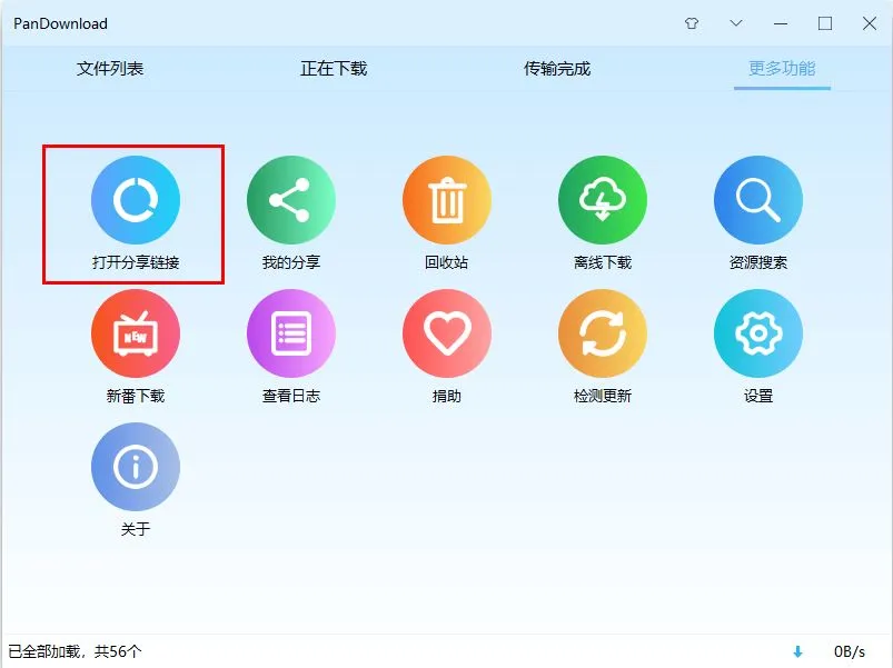 登录之后,其实软件就像一个浏览器,主界面的就是打开分享链接的窗口,你可以通过“更多功能”中的“打开分享链接”调出页面,登录成功的,在页面的左上角有账号昵称提示,这个时候你就可以去下载自己网盘里的东西。