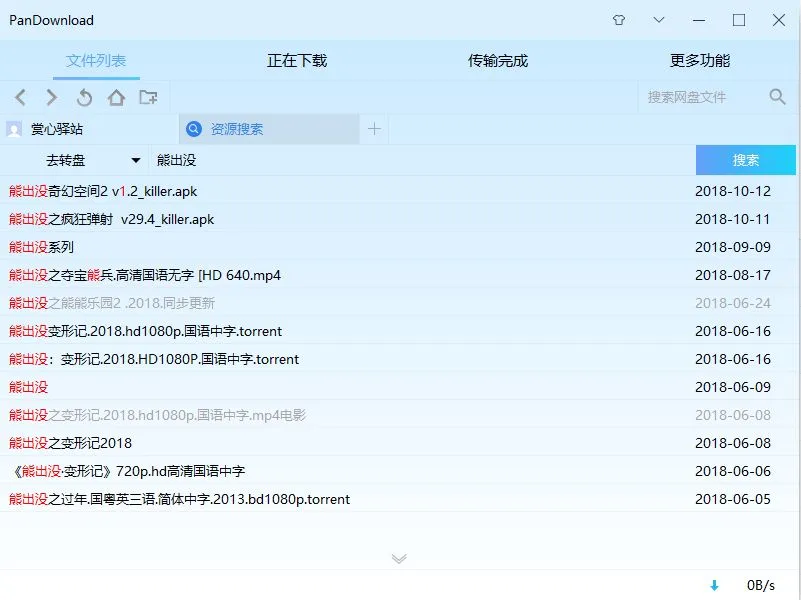 软件的功能还不止这些,其中最为便捷强大的,莫过于更多功能中的搜索功能,如下图所示,这个是前天推送手机版搜索软件后,大家所期待想要电脑版的一个功能,简简单单即可搜索度云里面的文件,有两个搜索引擎可以切换,效果还是很不错,搜索完成后也能马上进行保存或是下载,这点很贴心。