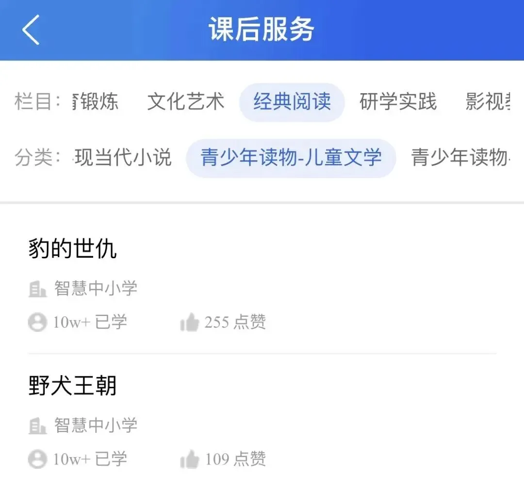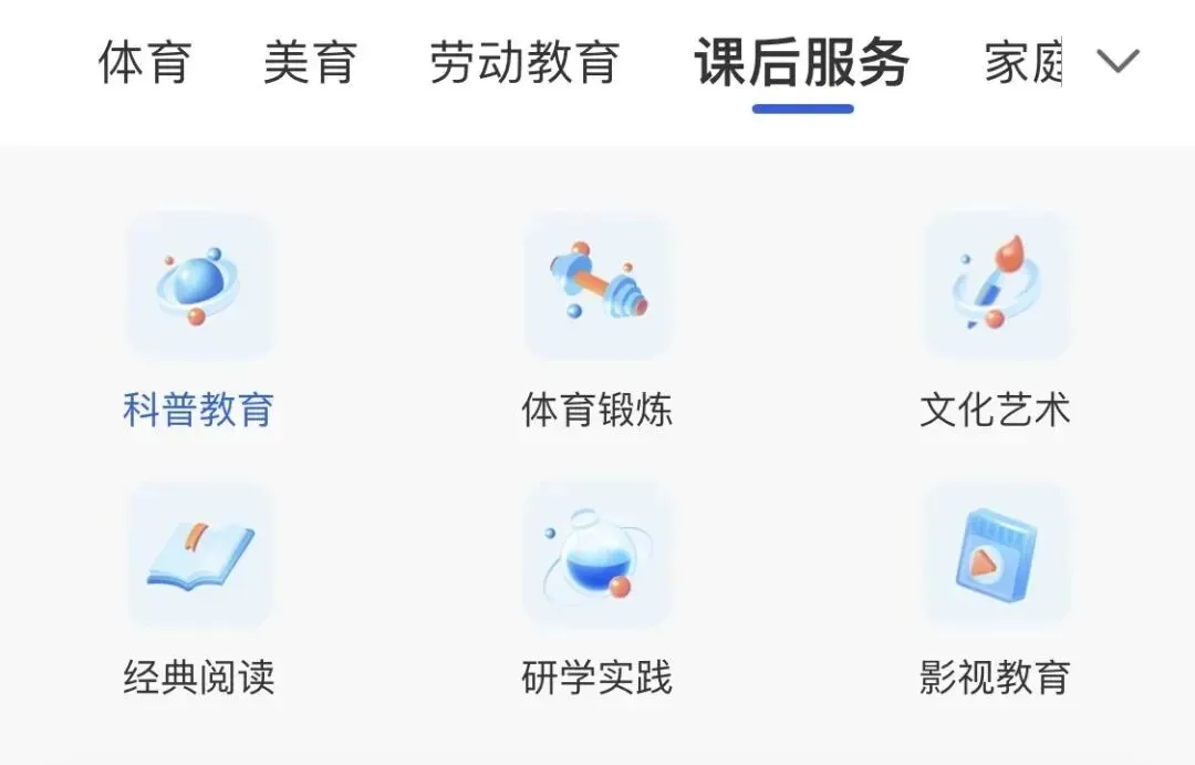 接下来,我们看下一个重要专栏“课后服务”,这里也是有点东西的。分为:科普教育、体育锻炼、文化艺术、经典阅读、研学实践、影视教育。