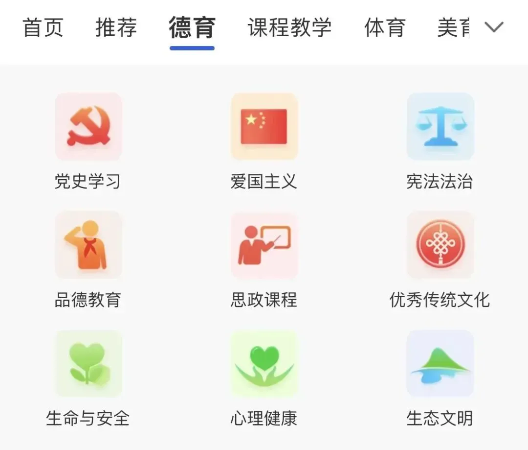 最后我再说说“德育”这个专栏,里面有:党史学习、爱国主义、宪法法治、品德教育、思政课程、优秀传统文化、生命与安全、心理健康、生态文明。