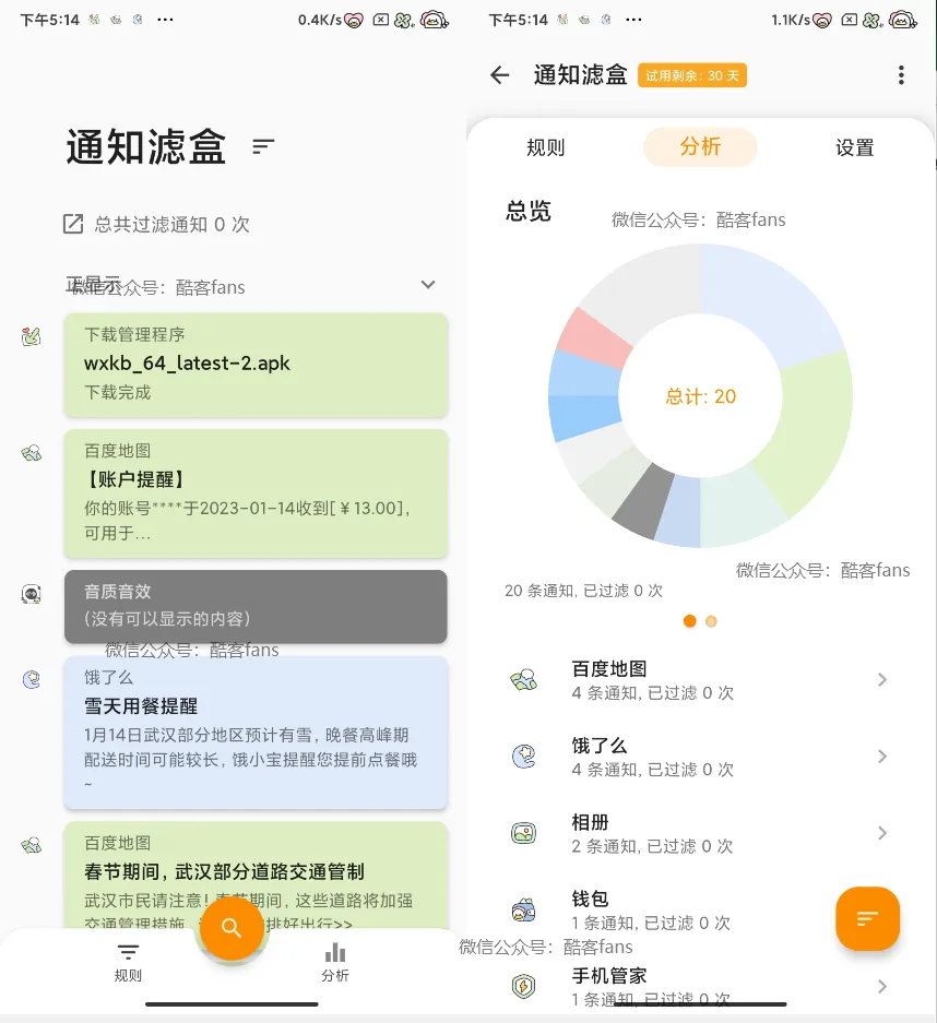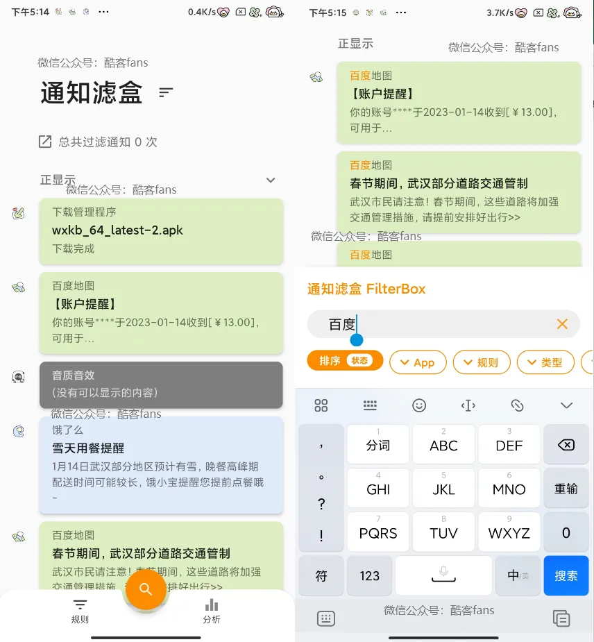使用通知滤盒,你可以查看系统所有出现过的通知、并对这些通知进行分析,筛选出有用的内容;根据APP、关键词搜索通知内容;添加自定义规则、APP黑白名单、正则表达式等方式过滤掉无用的应用通知内容。