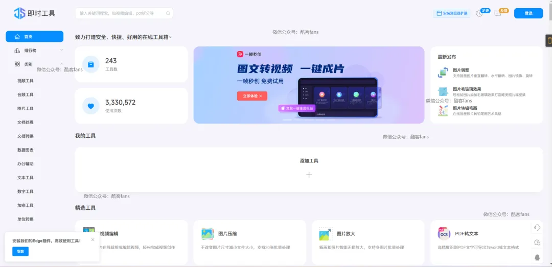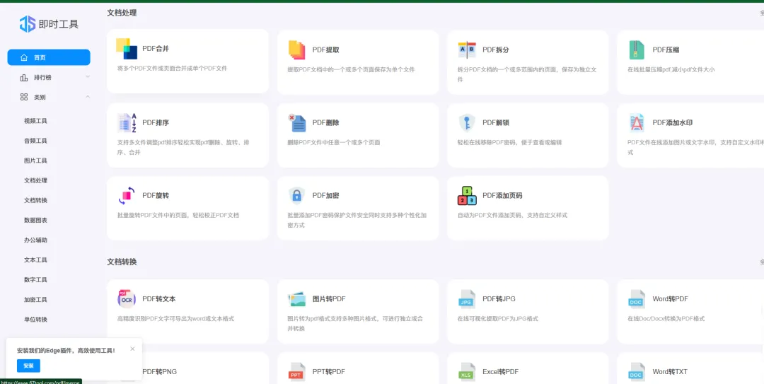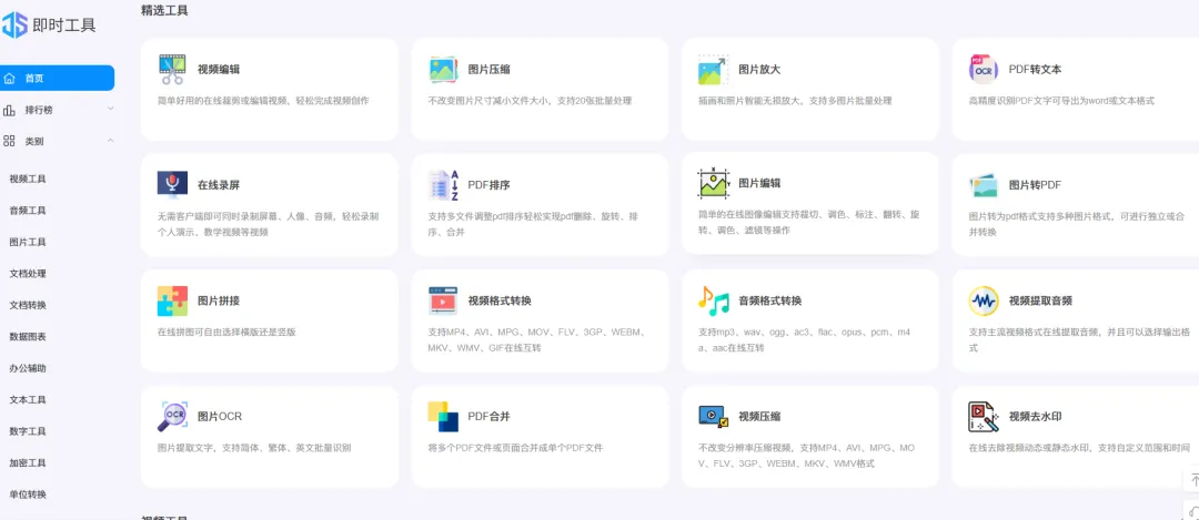 这是一个个人开发者做的网页版的工具集。网站内涵盖了从视频工具、音频工具、图片工具、PDF 工具、办公辅助、图表文档PDF、设计工具、文本工具、数字工具、加密工具等等,目前估计有200多个工具,并且完全免费,没有广告,即开即用,非常良心。