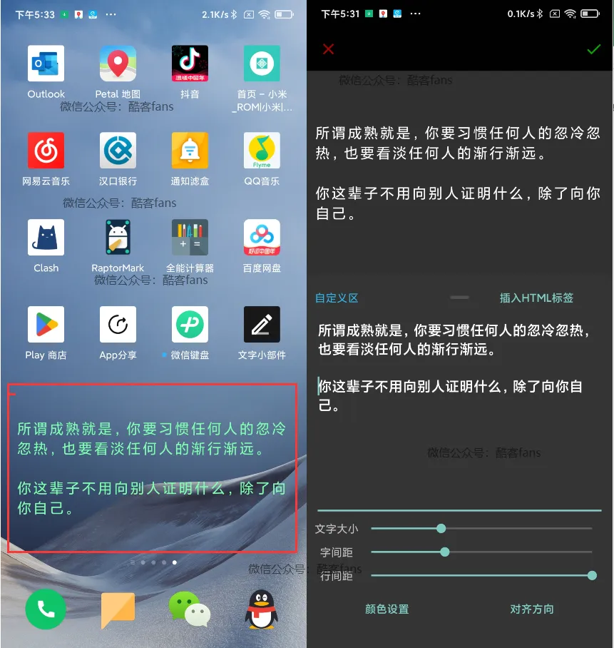 功能如其名,这是一个基于 Android 原生小部件开发的可以显示文字的小部件。非常简洁,仅 50 KB,可以在横屏、竖屏上使用。使用这个小部件,你可以在桌面上显示一段你想看到的文字(部分网页表情也可以)。这段文字可以随时修改,因此,你可以把它作为桌面便签、桌面笔记、桌面待办事项记录等