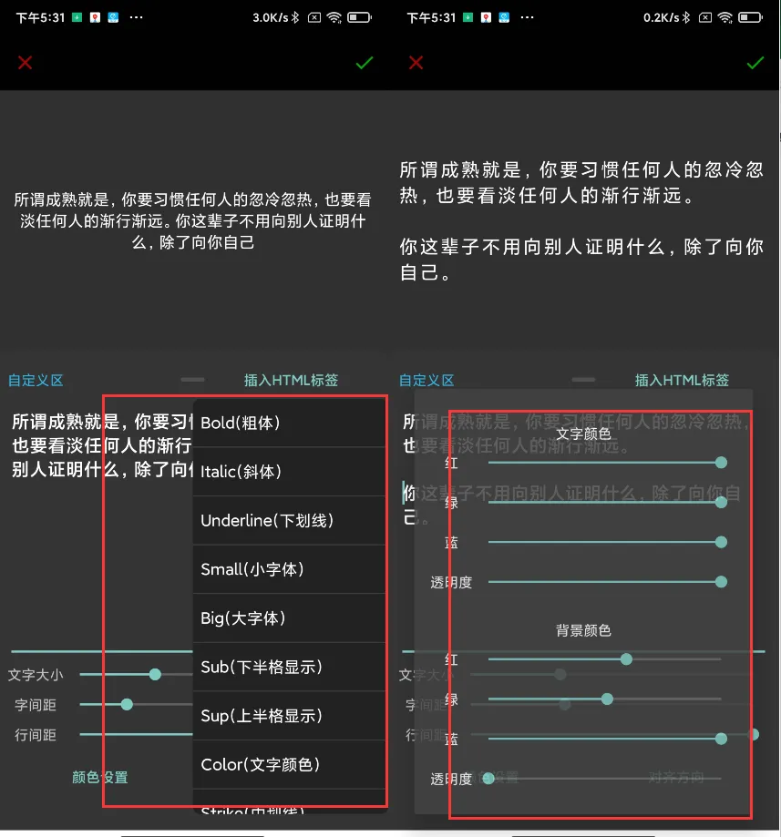 显示效果上,它支持自定义文字大小、颜色、透明度、对齐方向、行间距、字间距、背景颜色、背景透明度;并且支持使用HTML标签,为某段文字添加粗体、斜体、下划线、中划线、颜色、上半格显示、下半格显示、加大、减小字体的属性(属性可以任意叠加)。所有效果均可以实时预览,相当够用了。