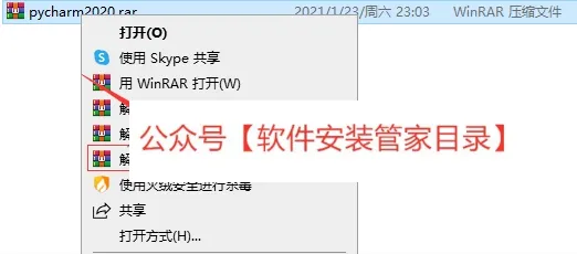 1. 鼠标右击软件压缩包,选择“解压到pycharm2020”。