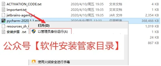 2. 打开解压后的文件夹,鼠标右击“pycharm-2020.1.1.exe”,选择“以管理员身份运行”。