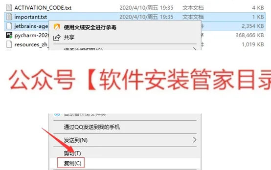 9. 返回解压后的文件夹,鼠标选中“important.txt”和“jetbrains-agent.jar”右击选择“复制”。