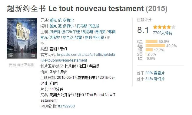 剧情简介:全能的神确实存在,并且居于布鲁塞尔寻常住宅?还用电脑掌管一切生命?《小英雄杜杜》鬼才导演继《小国民尼谟》后又一奇幻狂放之作,这次斗胆玩转宗教。原来神不只有独生子道成肉身,还有个反叛的十岁女儿,对人间种种不幸看不过眼,决定离家出走改造世界,推翻暴君父亲。先发短讯泄露天机公 布大限,再化身小救主,下凡召集六大使徒,聆听各人心曲,开启《超新约全书》。暴怒的神也追到凡间,力阻女儿造反。天马行空出奇制胜,更有凯瑟琳•德纳芙演富婆使徒,与大猩猩擦出爱火花。