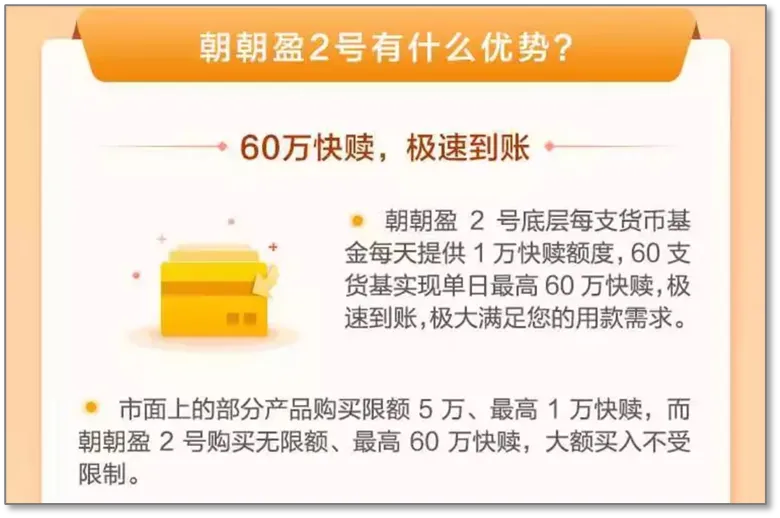 比如招行的朝朝盈2号会对接60只货币基金,支持60万以内资金的实时到账。