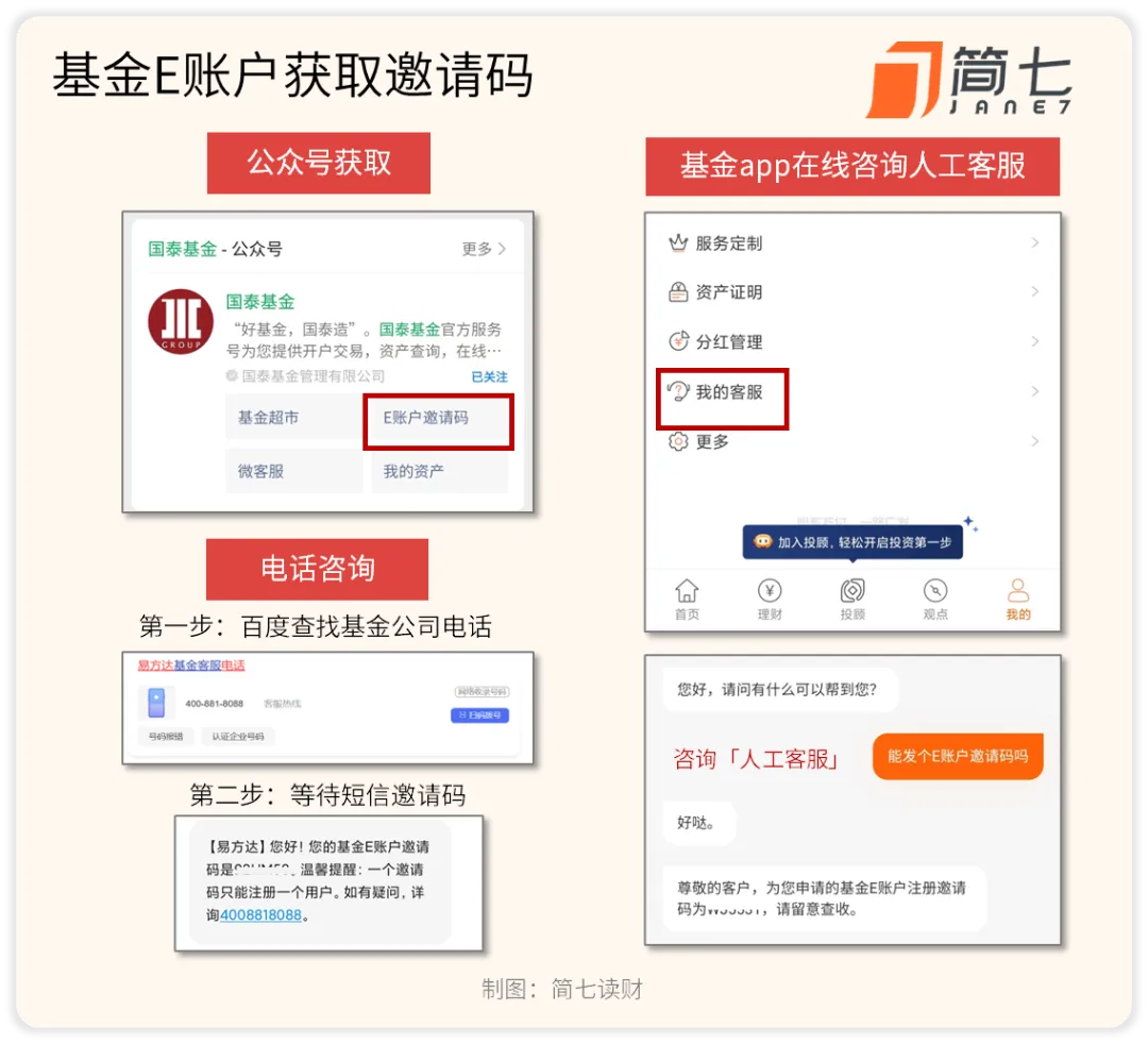 或者给基金公司打电话、咨询在线人工客服,我试了试,登记下信息(手机号)就能收到邀请码。