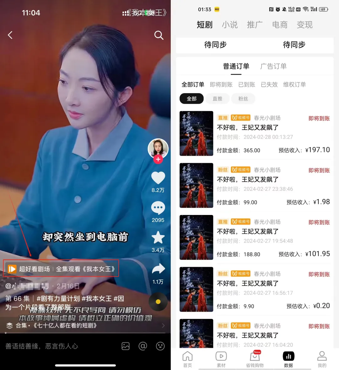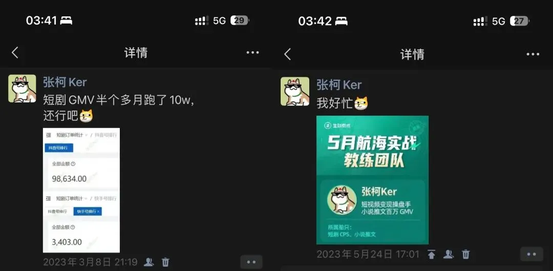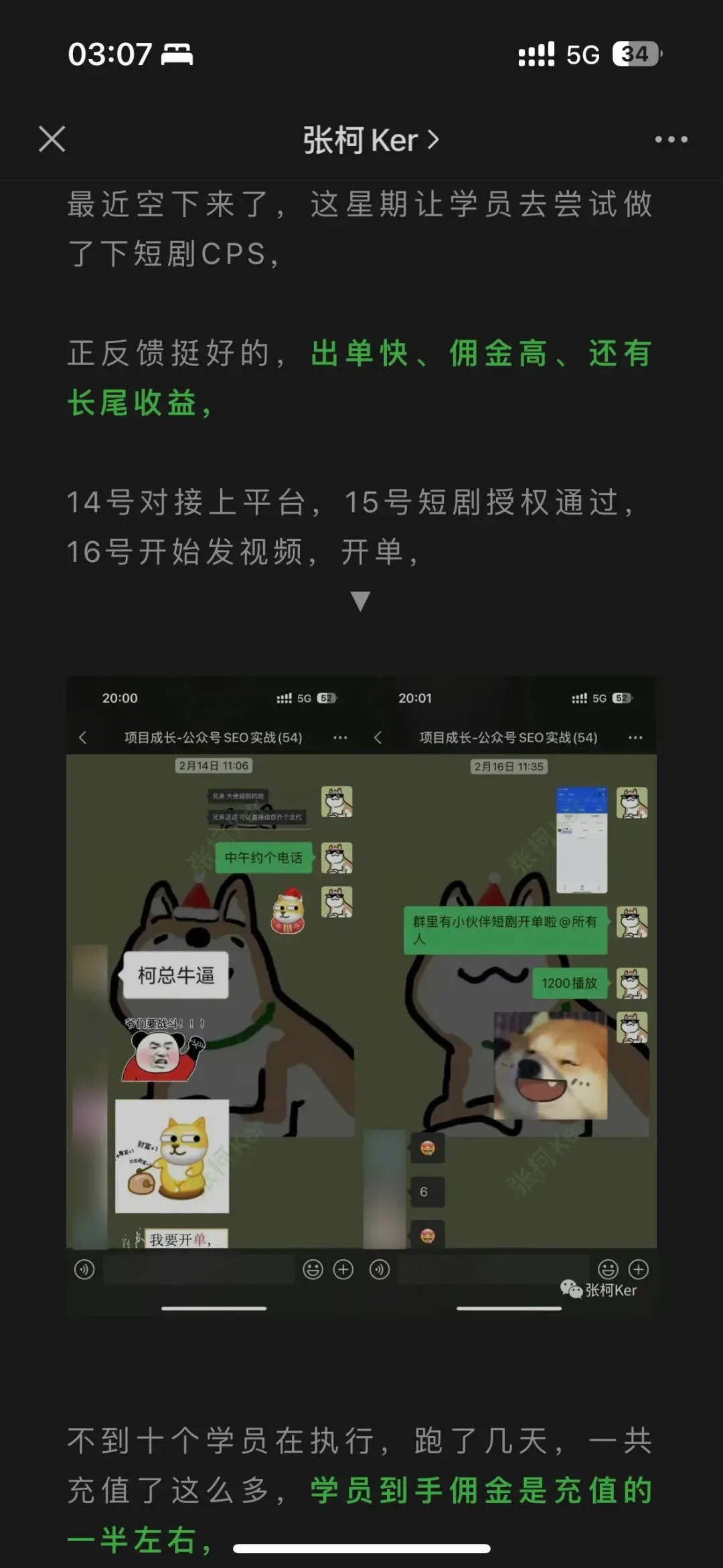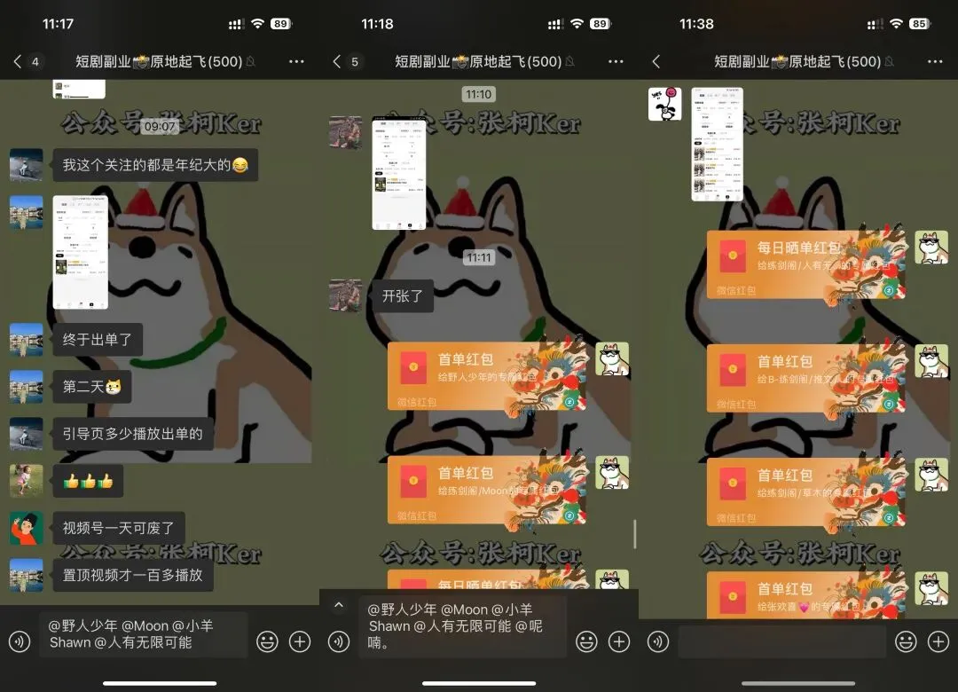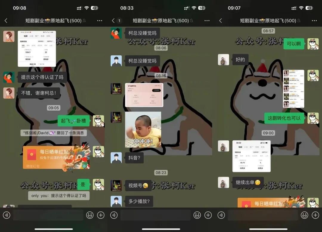 短剧副业原地起飞,附免费陪跑教学 人若无名,专心练剑。 何以解忧,唯有退休。 本文1170字,阅读约需5分钟 大家好,我是张柯Ker, 好久不见,两个多月没更新了, 最近这两天短剧项目异常的好做啊, 憋不住了,得出来晒一晒, 28号拉群,29号就有人出单, 然后1号、2号连续有人爆单, 次日即可提现, 项目进程在朋友圈里全程直播~ 短剧这个项目呢,在去年的2月份我就进场了, 算是全网第一批, 在去年2月底的公众号文章里还提及了下, 那个时候还得混剪做原创, 剪一个视频得两小时左右, 一开始非常容易爆单,还划得来, 5月份还去当了生财的短剧航海教练, 后面七八月份转化低于预期,划不来,就跑路不干了, 最近为什么短剧又好做了呢? 因为不用原创剪辑了,懂的都懂, 前脚刚把视频从抖音里下载下来, 花两分钟丢剪映里套个模板, 导出、发布、坐等爆单,一气呵成, 多花两分钟算我输, 群里每天都在嘎嘎出单, 太多了,放不下,随便截点, 短剧这个项目, 最近就是处在老项目新的风口期, 错过这村就没这店了, 等下次这么好做的项目出现,还不知道是猴年马月, 大环境不好,大家应该都感受到了, 留给普通人的机会不多了, 且行且珍惜, 可能有的小伙伴还不知道短剧项目是什么, 在这里简单介绍一下, 我们在抖音、视频号里发布短剧视频, 但我们发的视频都是不完整的,由此吸引用户观看后续, 用户通过视频左下角点进去想看后续,则需要充值, 金额从9.9~365块不等, 我们能拿到54%的充值佣金, 佣金比例后期还可以提升, 也就是如果一个用户充值了365, 我们就能赚197.1,如果十个用户呢? 而且,平台还有邀请奖励,鼓励大家互帮互助, 如果你想邀请朋友过来一起做, 他出单后,平台还会额外奖励他2%的充值佣金给你(可提升), 所以, 不管是出于项目的好做, 还是出于我之前一直念叨的「交个朋友系列」, 我觉得我都应该出来多吼几嗓子, 让更多人能赶上这趟车,多赚点钱, 自从拉了练剑阁的微信群后, 我公众号和朋友圈就都比较少冒泡了, 有收获的信息、好做的副业项目, 基本上都在群里就消化掉了, 懒得对外, 这次难得遇上这么好的机会, 我觉得我应该把项目放出来, 索性玩把大的, 免费教学、免费进群、免费陪跑, 还可以免费拉朋友进群一起做, 欢迎转发文章~ 当然, 巨婴就别来找骂了, 我可不是什么老好人, 免费就是谁也不欠谁, 我可以带你玩,也可以不带你玩, 看我心情,看你表现, 教程看都不看就在群里瞎问的, 给你一脚踢到西伯利亚晒太阳, OK,废话了这么多,项目怎么参加呢, 很简单, 扫码注册,先下载短剧的APP, 短剧的充值链接要挂到视频里,只能用APP跳转进去, 不下载APP是挂不了充值链接的, 然后, 在APP里截图导师微信,确定是我, 复制我的微信号,添加, 备注:短剧, 然后把「导师微信」界面的截图发给我,即可进群, 就这么简单, 手快有,手慢无, 说不定哪天项目就不好做了, 说不定哪天我就懒得带队了, 时间不等人, 以上,祝好, 推荐阅读: 《练剑阁,带你赚钱的同时,让你获得十倍以上的确定性成长》