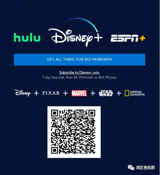 如果一周后还想继续使用,推荐购买其包月服务(6.99$每月,或69.99$每年)、或者使用Disney+/Hulu/ESPN+绑定包月服务(12.99$每月),如果有时间带娃家庭非常划算,点击文末“阅读原文”或长按下图二维码即可进入!