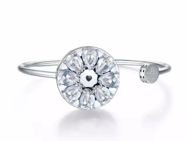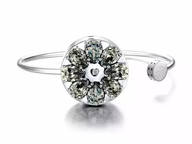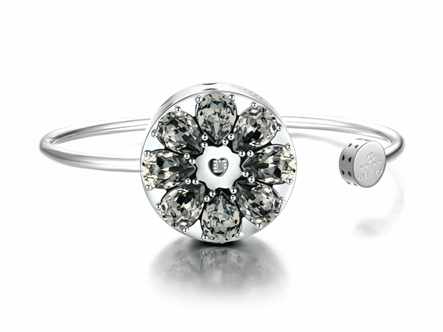 绽放系列的手镯,表面镶嵌施华洛世奇水晶,采用925银镀18K金电镀技术,手镯很有弹性,可以轻松扭转,手腕不同粗细的女性都可以佩戴。颜色有:银灰、银白、金黄,三种可选。