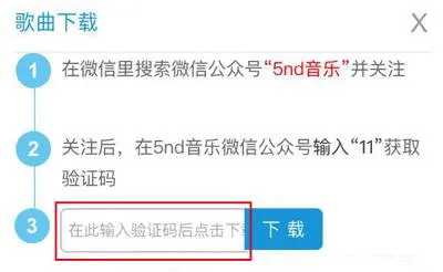 如果您在5nd音乐网(5nd.com)下载歌曲,需要关注“5nd音乐”公众号后,输入入“1”或“11”后获取下载验证码,然后在网页提示框内输入您的下载验证码即可。验证码获取且音乐下载成功后,无需再次输入验证码即可下载全站歌曲,验证码有效期一般为3-5天,具体时长根据您设备的浏览器而定。如更换设备或更换浏览器后需重新输入验证码,建议您关注“5nd音乐”公众号后不要取消关注或屏蔽消息,这样的操作不仅会影响到您在5nd音乐下载音乐,更会错过我们公众号推送的精品内容,谢谢您的支持!