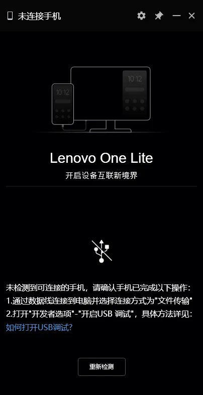 安装完Lenovo One Lite后,打开软件,在手机端开启USB调试模式,并用数据线连接手机和电脑,即可正常使用。