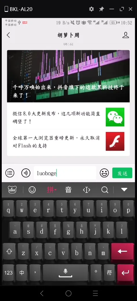 支持单击、长按、滚动、滑动、拖动等常用操作,支持微信、QQ快速发送消息(Ctrl+Enter),可使用电脑端的输入法在手机界面内进行输入。