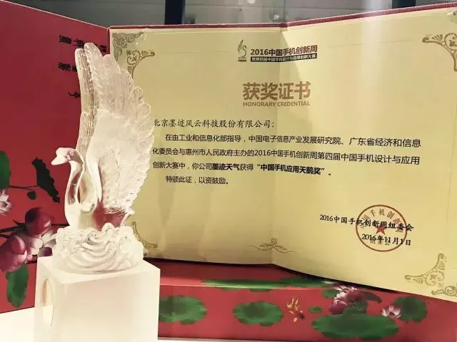 11月1日,万众瞩目的2016中国手机设计与应用创新最高奖天鹅奖在“天鹅之城”惠州隆重揭晓。墨迹天气作为时下最受欢迎的天气类APP,一举斩获中国手机应用最高奖项“天鹅奖”。除此之外,一同获奖的还有华为、OPPO等知名手机品牌和名片全能王、易信、咪咕影院等APP。