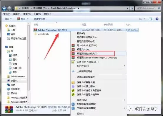 1.选中【Photoshop CC2019】压缩包,鼠标右击选择【解压到Photoshop CC2019】。