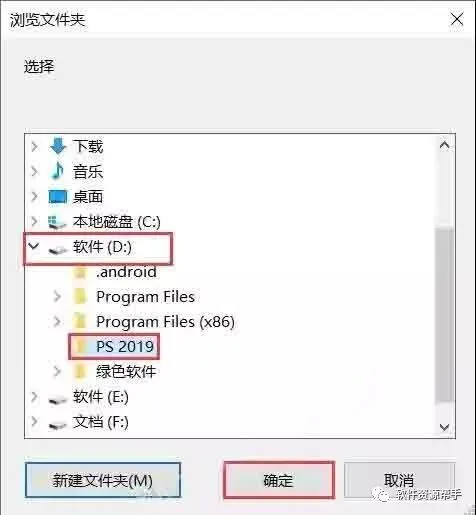 5.建议安装到除C盘以外的磁盘,可以在D盘或其他盘新建一个【PS 2019】文件夹,然后点击【确定】。