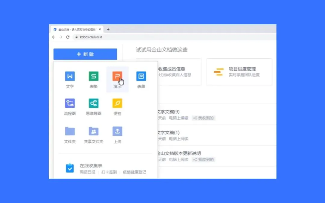 你只需要顺手找个浏览器,输入这个网址 kdocs.cn ,即可快速创建文档、表格、演示、表单、流程图等等。