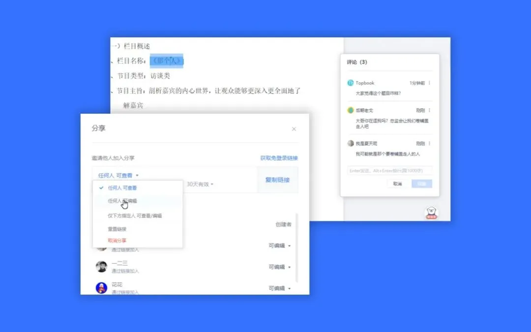 使用传统客户端产品,你可能需要不断经历版本的更替,电脑桌面上通常会堆砌几个甚至数十个不同文件。而在在线工具比如金山文档中,永远都只有一个版本,其他人可以通过你分享的链接参与创作,相互评论、批注。有意见,一起说,而且一次说清楚。不止如此,你还可以在历史记录中看到所有的改动和协作足迹。