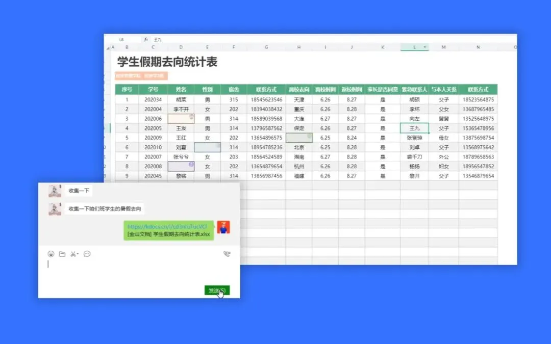 收集学生或员工信息时,不再需要一个个接龙填写,只要在群里分发同一个链接或小程序,几乎就能在一两分钟内迅速搞定。如果填写者之间需要互相隐私,直接发送表单,所有人分别填写,信息一键汇总到表格,而且最多可以收集百万条信息。