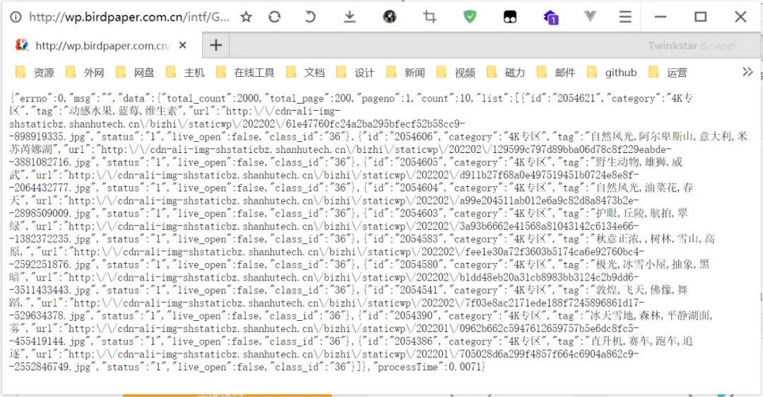 拿壁纸聚合的站点来说,想要这样把各个平台的图片聚合在一个界面里,就需要用到API调试工具,比如要把360极速浏览器的壁纸提取出来,就可以通过抓包来获取图片的地址。
