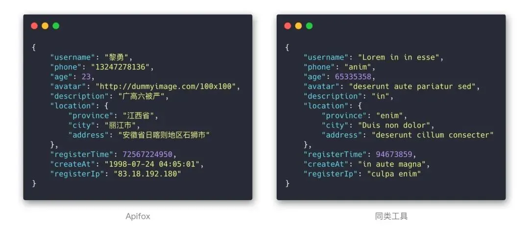 先放一张图对比下 Apifox 和其他同类工具零配置mock 出来的数据效果: