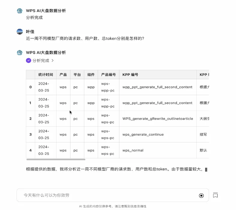 基于商汤“日日新”延伸出的代码模型能力打造的WPS大盘数据分析应用,通过对话就能完成数据理解与分析任务。