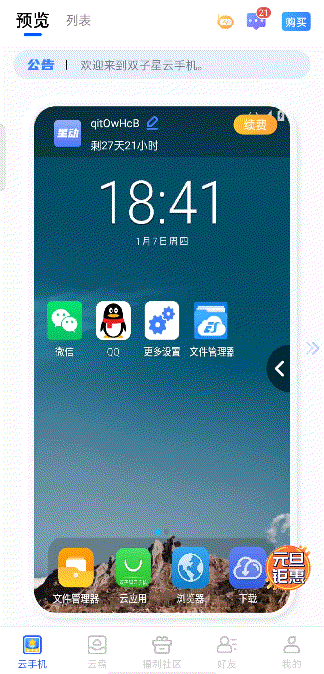 操作流程非常简单,不用越狱,更不用改什么设置,注册并登录双子星云手机账号,然后生成云手机,接着在云手机内登录微信就可以了。