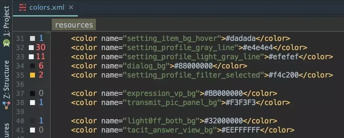 最左侧一栏看到没,可以直接显示你所有资源引用的数字,支持 string、color、boolean、array、dimen、drawable 等等标签,它有哪些使用场景呢?