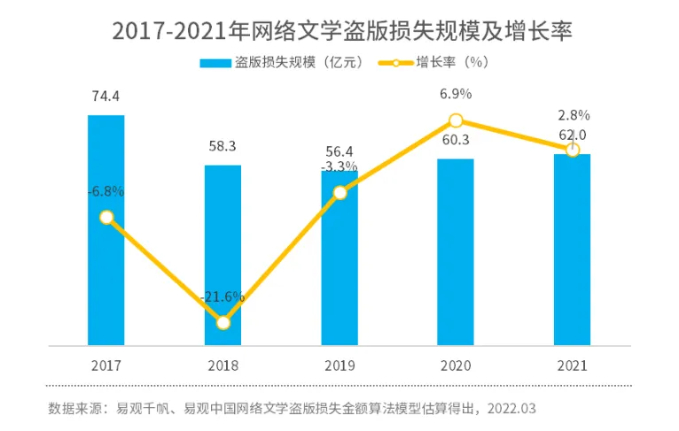 据统计,2021年网络文学盗版所取得的非法收入达到了62亿元。这个数字是什么概念?单从收入上来说,几乎碾压了76%的A股上市公司在2021年的全年营收。