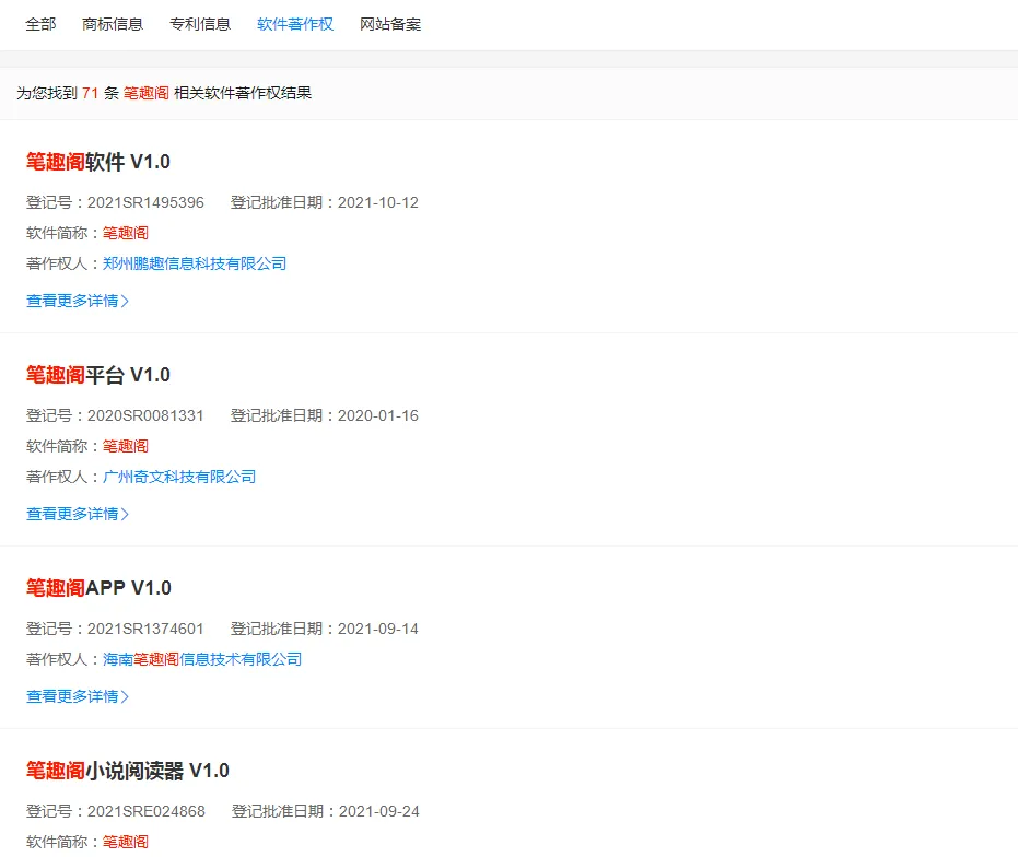 在天眼查上,跟笔趣阁相关的软件著作权登记已经超过70条,包含笔趣阁软件、笔趣阁小说阅读器等,著作权人也达到了55家。