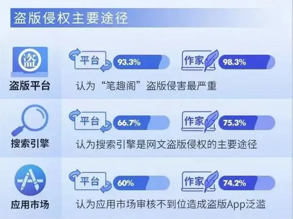 除了以笔趣阁为首的盗版平台之外,搜索引擎也逐渐发展成为读者获取盗版的首要平台,有超过80%的作家认为搜索引擎是网络文学盗版内容传播的主要途径。