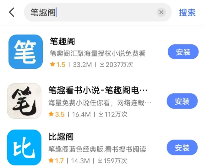 以笔趣阁为例,直接在各大应用市场上搜索可以看到很多同名APP,出现了“盗版之间相互盗版”的奇葩现象。