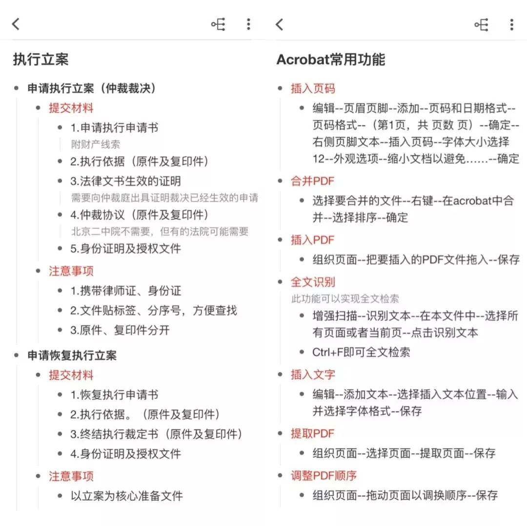律师通过幕布可以将自己总结的工作经验一键分享。曾经团队的实习生不知道申请执行立案需要准备哪些材料,不知道证据的页码怎么编辑,我随即发送他这样一个链接: