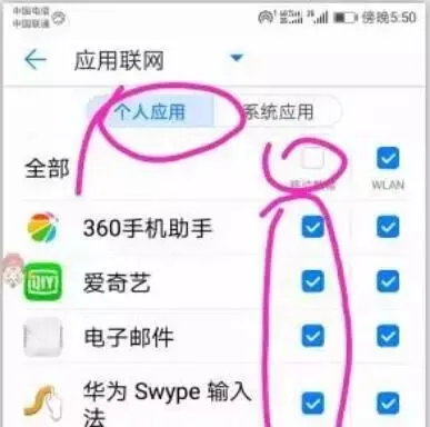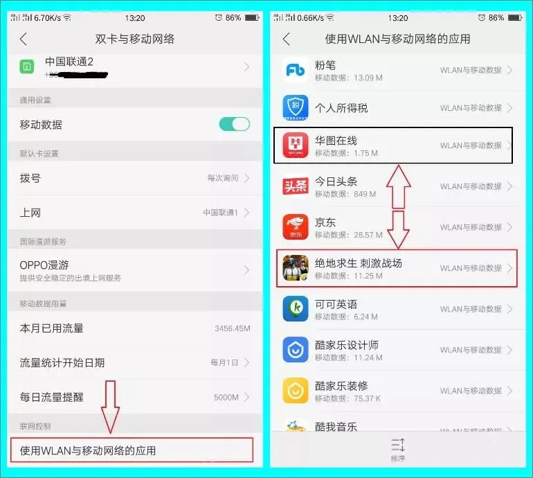 OPPO:设置–双卡与移动网络–使用WLAN与移动网络的应用;