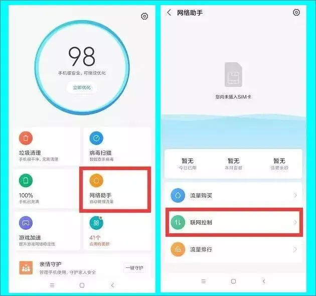 打开“安全中心”,点击“网络助手”,在网络助手页面,点击“联网控制”,即可。