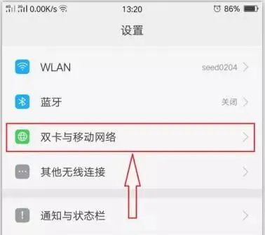 打开“设置”,点击“双卡与移动网络”,在下方找到“使用WLAN与移动网络的应用”,点击即可。