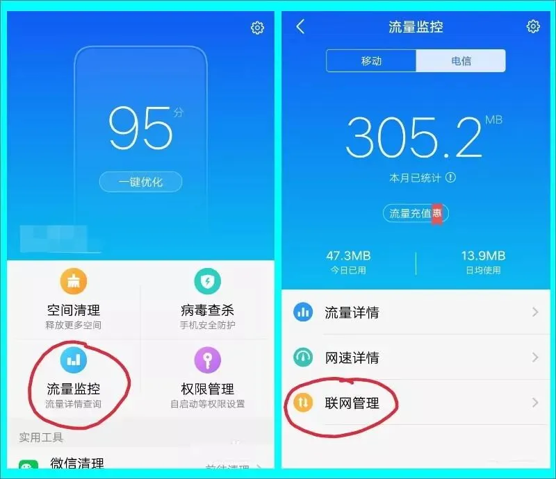 首先,打开“手机管家”,点击手机管家中的“流量管理”,进入“流量管理”界面后,点击“联网控制”按钮,就可以对单机游戏/软件,关闭移动网络和无线WiFi的权限了。