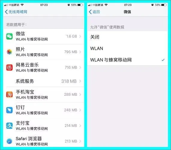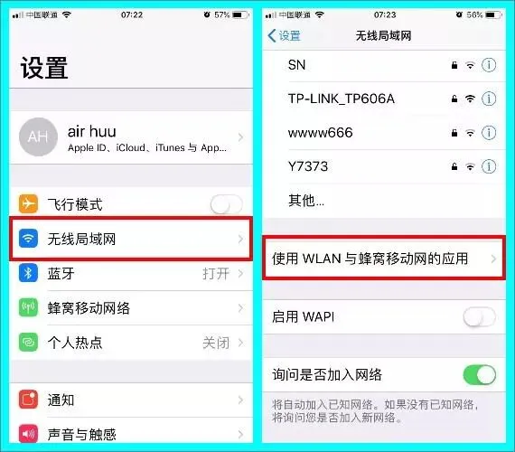 苹果:设置–无线局域网–使用WLAN与蜂窝移动网的应用。