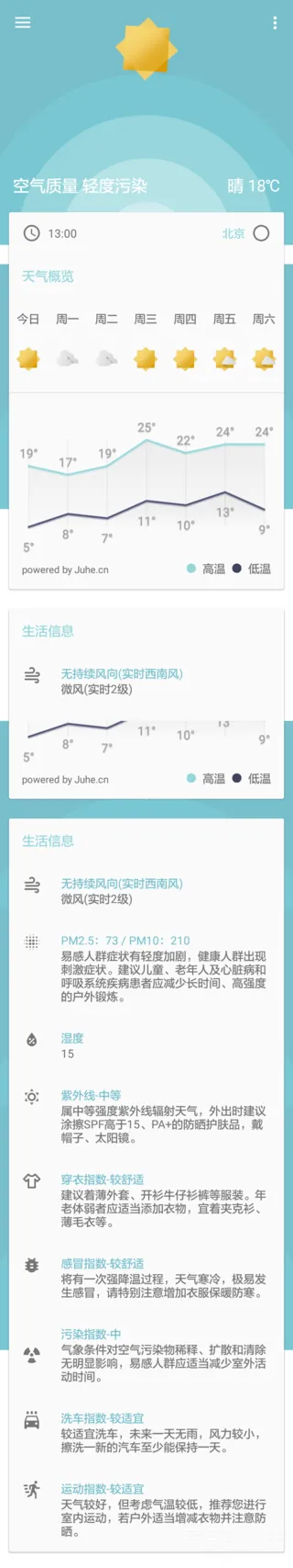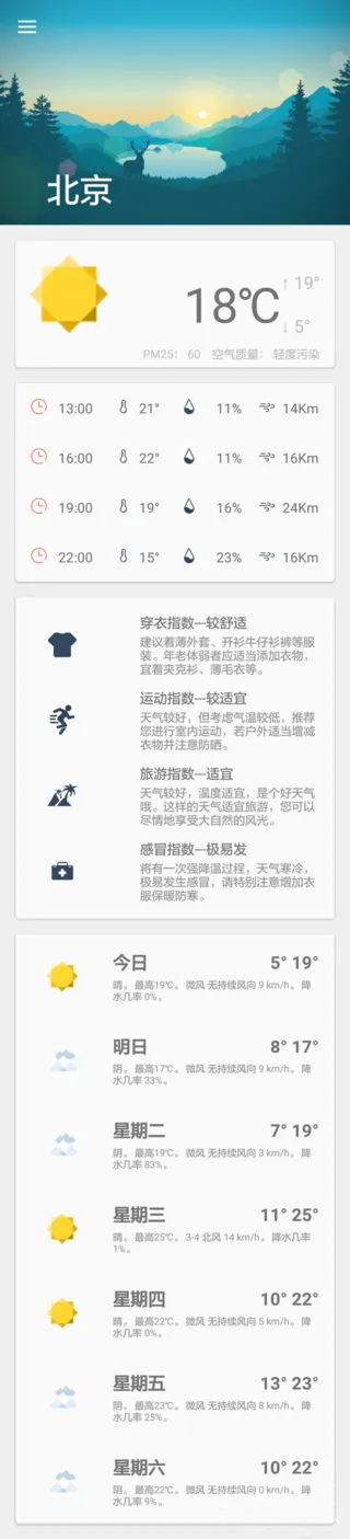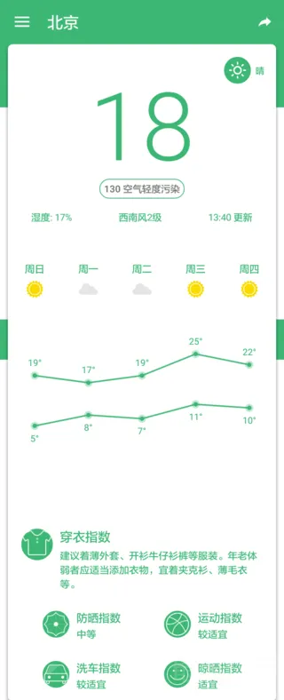 小沃天气并没有严格遵循Material Design的法则,而是创造了自己的风格,界面为舒适的绿色,所有的信息,都装在一个卡片来显示,作者巧妙的避开了拥挤,最后带来的是舒适。