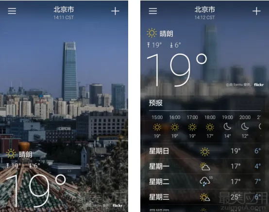 虽然雅虎天气有侧边栏,有卡片。但是其实并不能算上Material Design。界面总体看来有那么一点Holo时代的风格。颜值上,雅虎天气采用了各个城市的风景图作为背景,力求带给大家最愉悦的感受。不过在我们看来,这样做还是有弊端的,还是有很多人居住在小城市,这个时候雅虎天气就会配上与当天天气相符合摄影图片,可是有些图片的质量实在是太差了,丑的不堪一击,更多大城市的风景图质量也是很不好,比如上海。希望雅虎天气能够增加更多质高质量的作品。