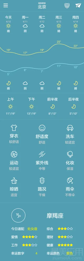 功能方面其实该有的也都有,主要的亮点还是种植小花的过程。另外,加入了星座运势什么鬼,我们是来看天气的,不是来查星座的!