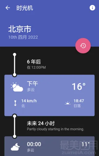 应用的形式与名字一致,「天气时间线」,主要就是查看时间线上每个时刻的天气。软件的设计很有意思,将时间线串联起来,有当前的天气,也有24小时天气,未来一周的天气,还有未来几年的天气(开发者你确定不是在开玩笑( ゚д゚))虽然不知道准确性,但是你现在就可以预测2022年北京冬奥会的天气不是很有逼格吗(●´ϖ`●)