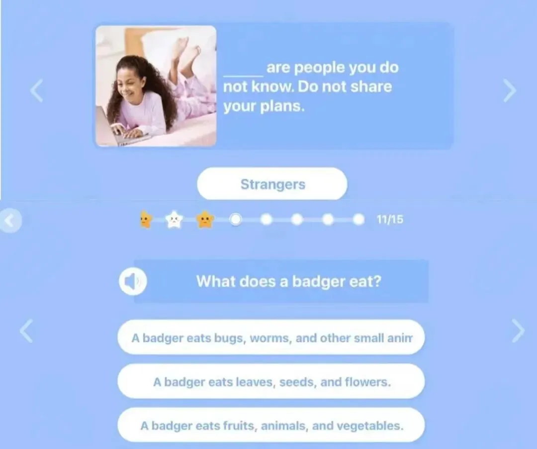 如果不确定孩子的级别,里面还有定级测试,在阅读的过程中也会有阶段性的测试来检验孩子们学习效果。