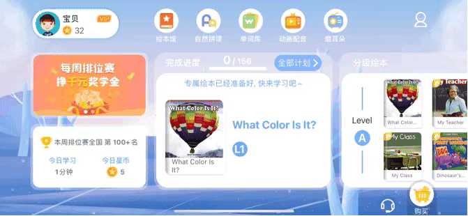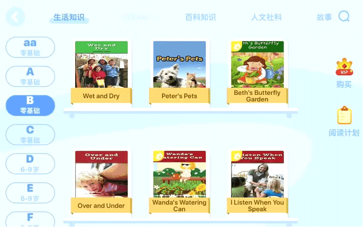 ABC Learning还可以帮孩子设计阅读计划。它把里面的读物分成了6个级别,每个级别精选了156本书,按照阅读计划来读也会很省心。