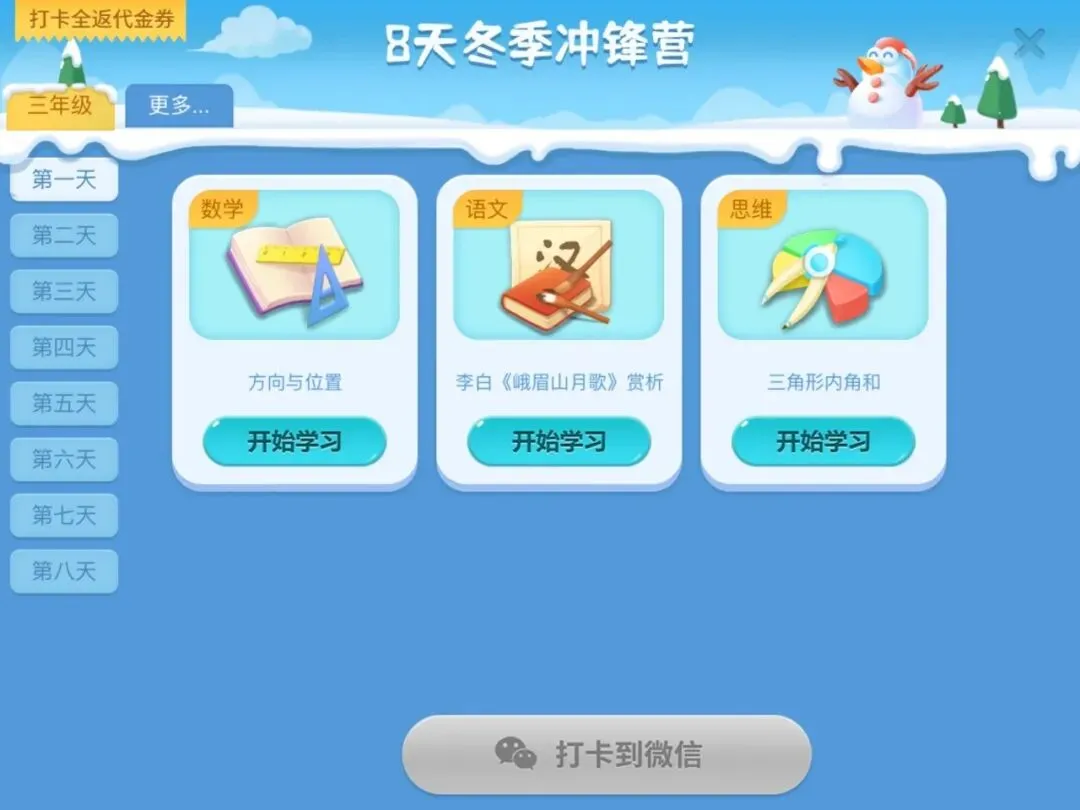 参与此次团购还将获赠冬季冲锋营一期,里面有8天的学习内容,包括语文数学和思维训练。这个冲锋营也有打卡活动,打满会送代金券。